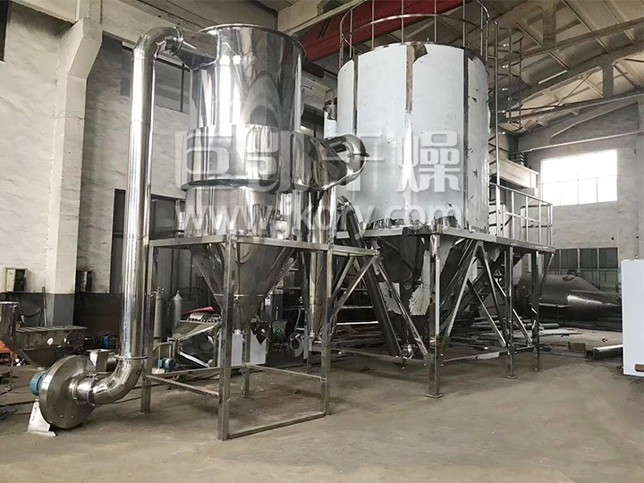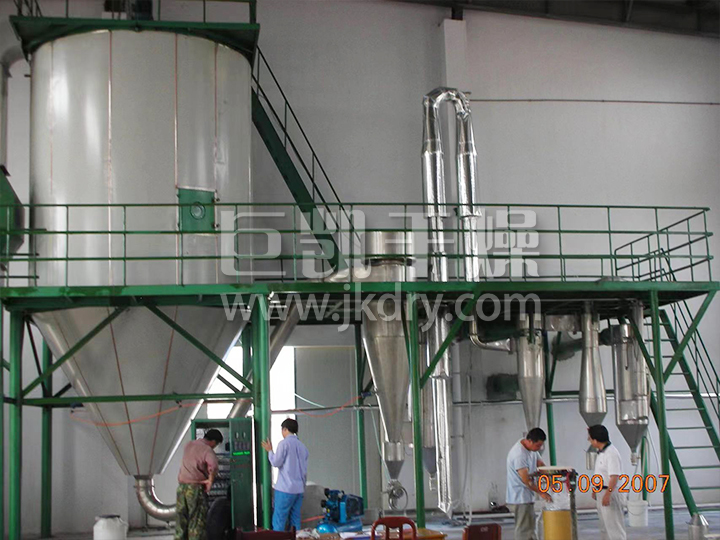 空气经过滤和加热,进入干燥器顶部空气分配器,热空气呈螺旋状均匀地进入干燥室。料液经塔体顶部的高速离心雾化器,(旋转)喷雾成极细微的雾状液珠,与热空气并流接触在极短的时间内可干燥为成品。成品连续地由干燥塔底部和旋风分离器中输出,废气由风机排空。