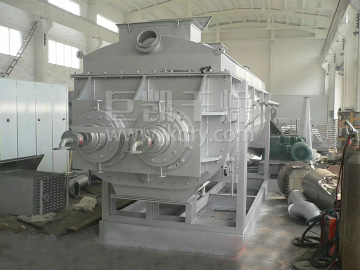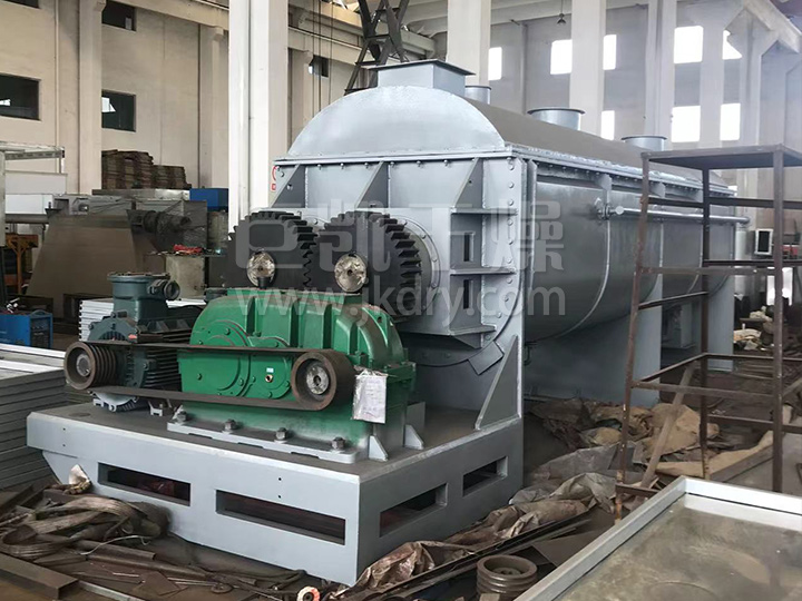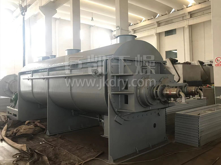 空心轴上密集排列着楔型中空浆叶,热介质经空心轴流经浆叶。单位有效容积内传热面积很大,热介质温度从-40℃到320℃,可以是水蒸汽,也可以是液体型:如热水、导热油等。间接传导加热,没有携带空气带走热量,热量均用来加热物料。热量损失仅为通过器体保温层向环境的散热。楔型浆叶传热面具有自清洁功能。物料颗粒与楔型面的相对运动产生洗刷作用,能够洗刷掉楔型面上附着物料,使运转中一直保持着清洁的传热面。浆叶干燥机的壳体为Ω型,壳体内一般安排二到四根空心搅拌轴。壳体有密封端盖与上盖,防止物料粉尘外泄而充分发挥作用。